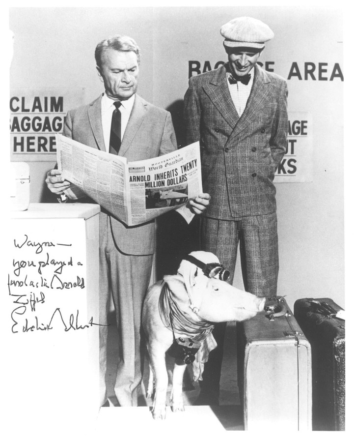 Arnold was the pig in Green Acres who was treated like a person by everyone except for the perpetually exasperated Oliver Douglas. The “son” of Fred and Doris Ziffel, Arnold attended school, played the piano, painted, was even drafted into the U.S. Army. This was no more zany than anything else that went on in the fictional town of Hooterville.