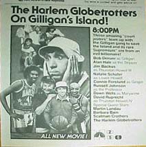 Harlem Globetrotters on Gilligans Island adThe Harlem Globetrotters on Gilligan’s Island continues the Fantasy Island format with Globetrotters appearing as themselves, and Barbara Bain and Martin Landau playing the movie’s villains. Jim Backus was at this point too ill to appear as Mr. Howell for more than one scene. Instead, we’ve got the Howells’ son, Thurston Howell IV, whom they missed so much that they never even mentioned him when they were shipwrecked.